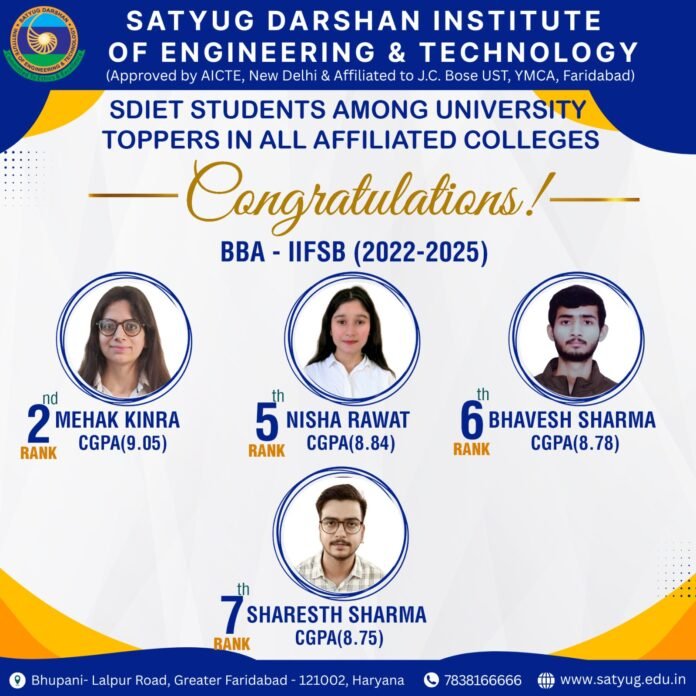 सत्युग दर्शन इंस्टीट्यूट ऑफ इंजीनियरिंग एंड टेक्नोलॉजी (SDIET), फरीदाबाद के लिए यह अत्यंत गर्व का विषय है कि BBA – फाइनेंशियल सर्विसेज एंड बैंकिंग (2022–2025) के छात्रों ने जे.सी. बोस यूनिवर्सिटी ऑफ साइंस एंड टेक्नोलॉजी (YMCA), फरीदाबाद से संबद्ध सभी कॉलेजों में उत्कृष्ट प्रदर्शन करते हुए शीर्ष यूनिवर्सिटी रैंक प्राप्त की हैं।